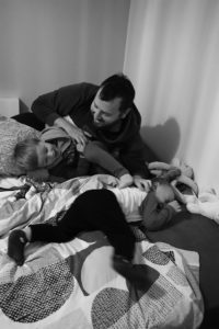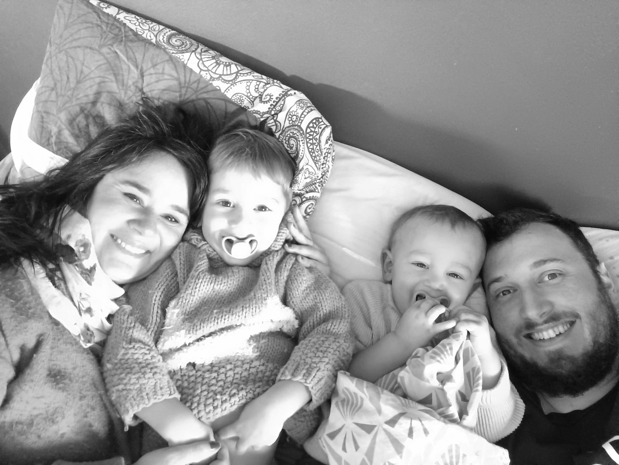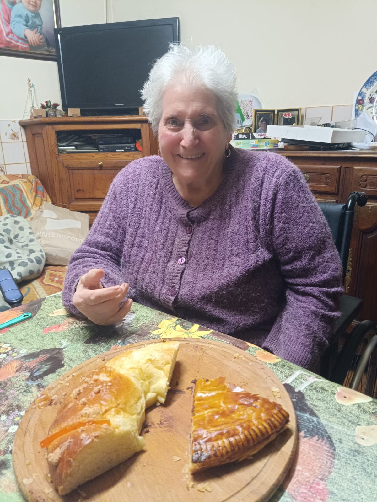 Gard Ostiralean, eskolatik satzean, jostatzeko gogoa aitarekin. Giliak ohe gainean. Igande goizean goxa bat denak elkarrekin jan aintzin. Igandean auzoekin krakada egin dugu aitak egindako biskotxarekin. Argazkian Emilienne da, Marie france-n ama
